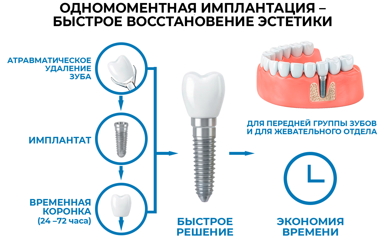 Одномоментная имплантация – быстрое восстановление эстетики, позволяет сократить сроки лечения, идеальный метод для передних зубов при отсутствии воспаления.